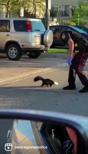 “What do you get when a Police officer and a skunk cross? Law and Odour,” police wrote. “Great job by Constable Zamani for taking this high risk task and helping out a furry friend in need.”