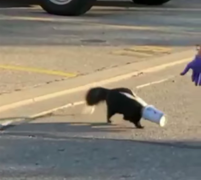 “Yup,” a police officer can be heard saying off camera. “That is a skunk with a McFlurry cup on its head.”