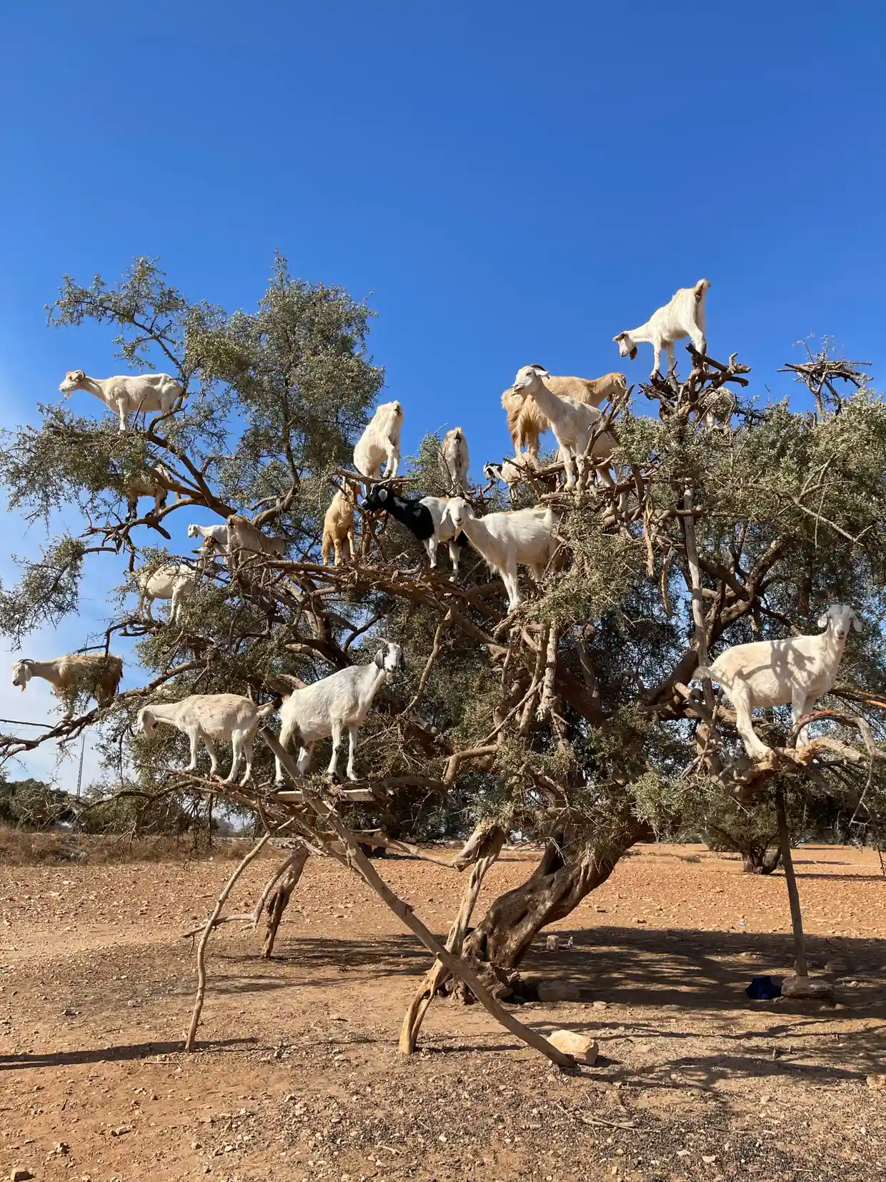 In Morocco, where food can be scarce, goats climb trees, especially argan trees because it can produce a fruit that is particularly appealing to goats.