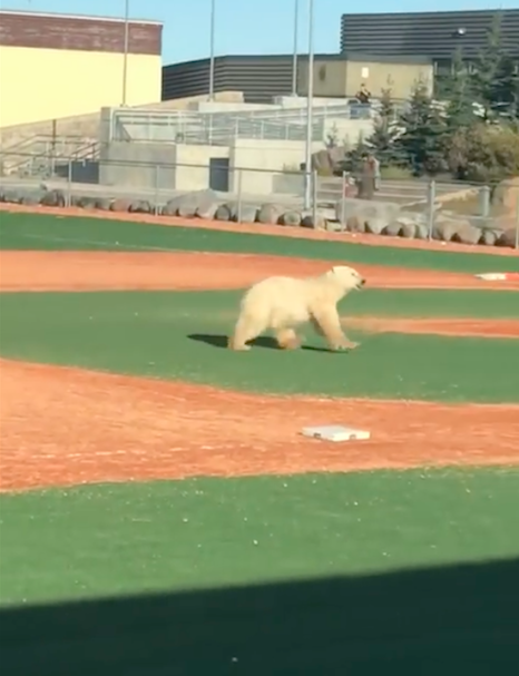 Polar bear runs the bases at Churchill, Manitoba ball diamond