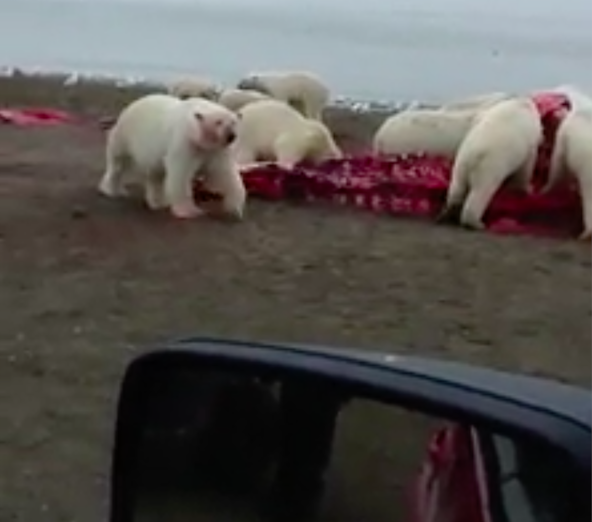 “Everyone gets along when there is enough for all,” the Alaska Life noted on its post with the incredible video. “Polar bears on Alaska’s North Slope feast on the remains of a whale!”