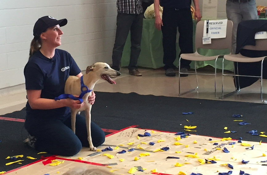 An elated Christie Springs with Toby, a Whippet that is very good a balloon popping/Chris Doucher