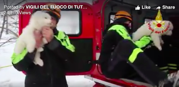 And yesterday, the Abruzzo sheepdogs, which resided at the mountainside hotel, were reunited with their three puppies. All were initially believed killed in last Wednesday’s devastating slide that buried the luxury hotel and the road to it, initially thwarting efforts of rescue crews.