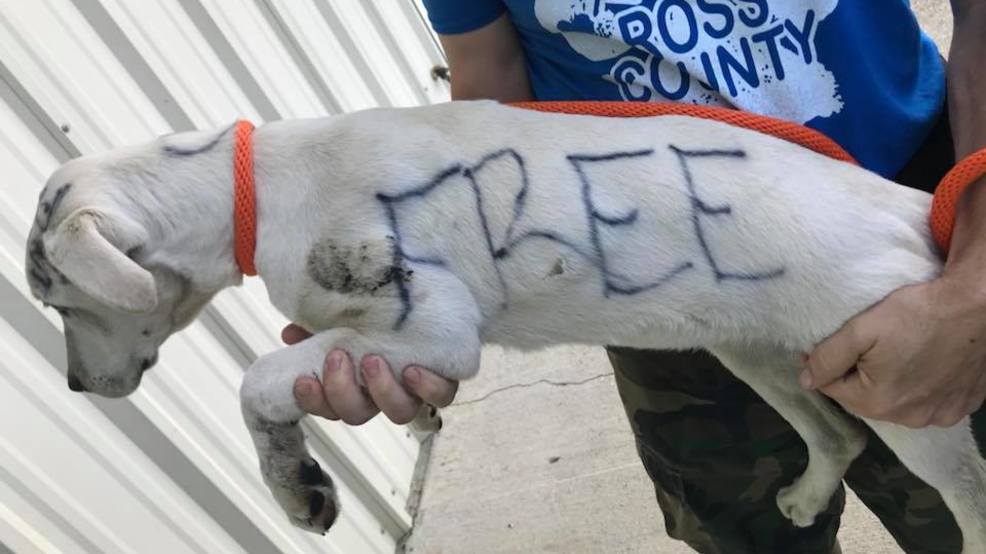 A sweet-natured puppy was abandoned in a cruel way, covered in permanent marker with words scrawled on her fur including Free, Good Home Only and I am a gift from God.