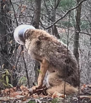 The first report of a coyote with a container stuck on its head came in a week ago.