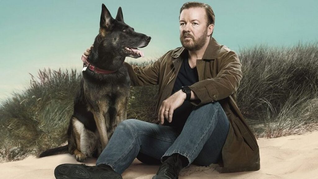 In After Life, Gervais plays a newspaper reporter dealing with the loss of his wife. Brandy, the couple’s dog, helps him through his grief — unconditionally.