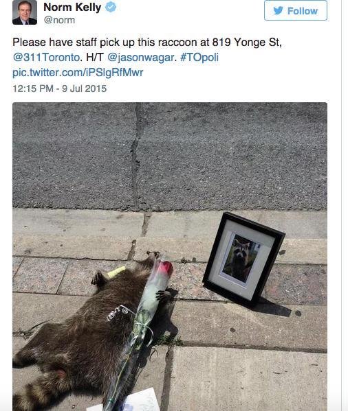 City councillor Norm Kelly directed staff to go pick up the raccoon and then joked that as a tribute, people of Canada’s largest city should leave their green bins open.