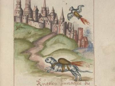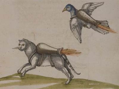 A warfare manual that dates back to the 1530s includes extraordinary illustrations of jet-propelled packs strapped to the backs of cats and doves. The document was digitized by the University of Pennsylvania, but it was only recently translated by one of the school’s historians, Mitch Fraas, after receiving an email that linked him to the odd drawings of the would-be ill-fated critters of a bygone era