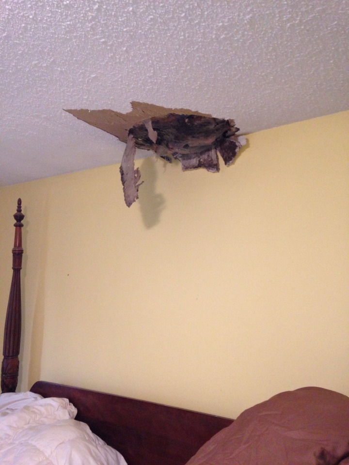 “Came home to a mysterious hole in my ceiling just above my bed,” she wrote on Facebook.