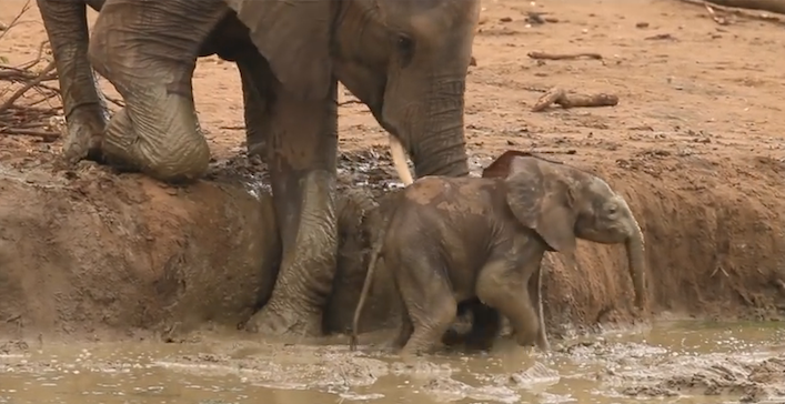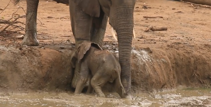 The tiny elephant wanders down the mucky channel looking for a less slippery escape route. Finally, the herd returns and a more experienced member intervenes with a “helping trunk.”
