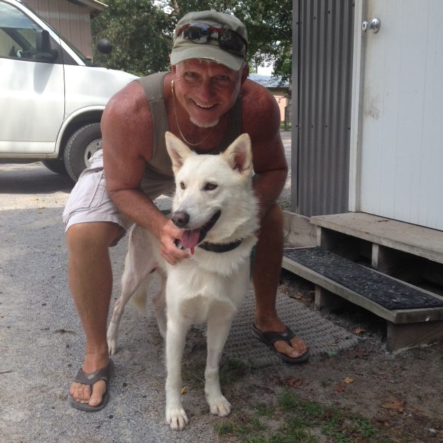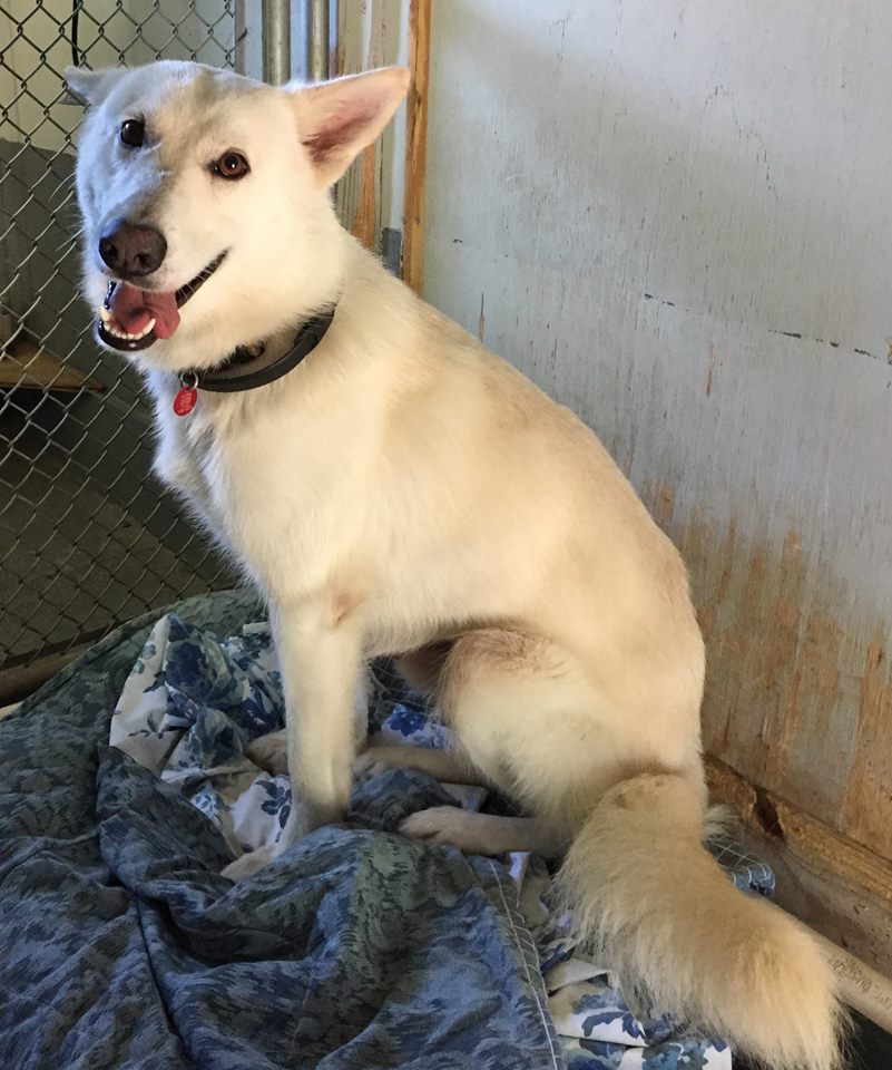Ghost was found on a rural road in Alabama. The 3-year-old white German Shepherd is loving and listens to commands, but is terrified of thunder.