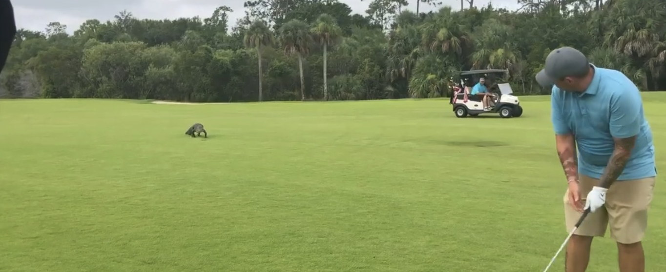 “I was lining up my approach shot from about 125 out. I knew he was coming up diagonally behind me,” West told McClatchy News. “He got to about 15 feet before he laid down as I swung. … My buddy Grant was getting a little nervous and wanted me to hurry up. … I was far more worried about leaving myself a makeable birdie putt than him (the alligator).”