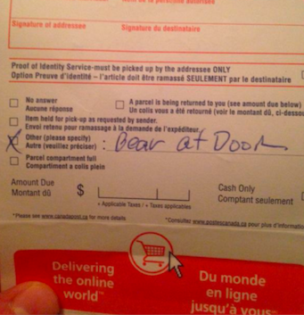Canada Post fails to deliver due to “bear at door” September 25, 2014 Neither snow nor rain nor heat nor gloom of night, but perhaps bears will stay these couriers from the swift completion of their appointed rounds. At… Continue Reading