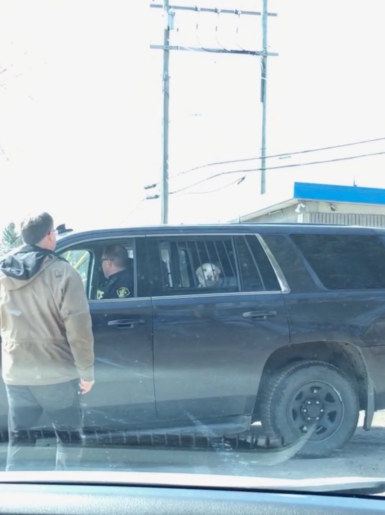 The officer who is approaching the bull terrier can be heard saying, “It’s okay, buddy. It’s okay.”