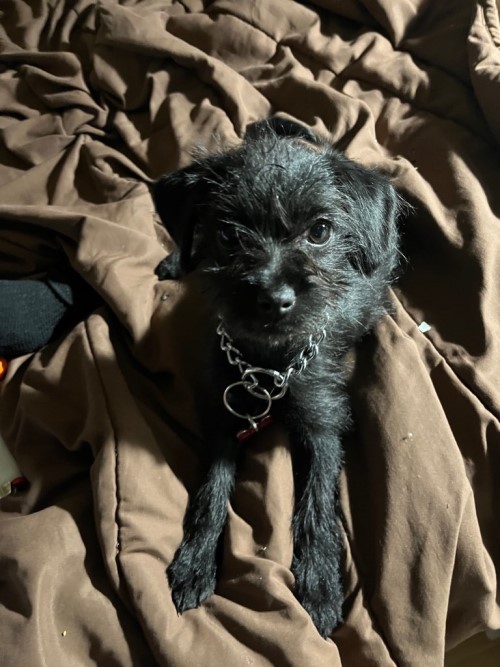 The teeny black dog is 6-months-old and she was wearing a black studded collar.