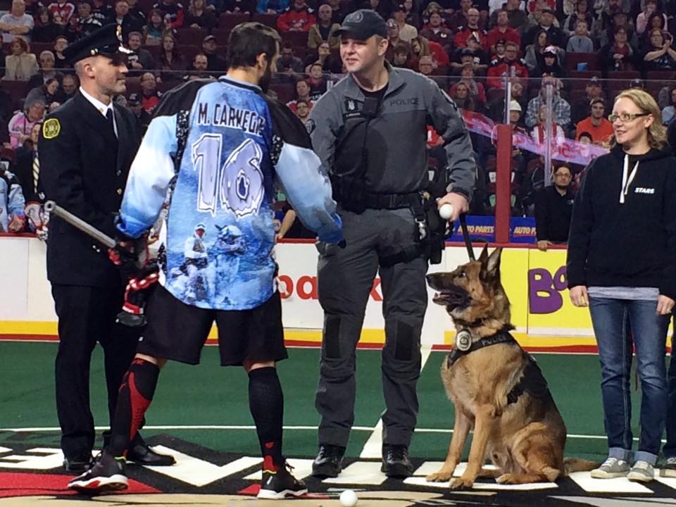 “We are so proud of Const. Williams and PSD Jag,” the Calgary Police Service posted on Facebook, “who took part in the ceremonial faceoff at the Calgary Roughnecks game tonight. Go Necks!”