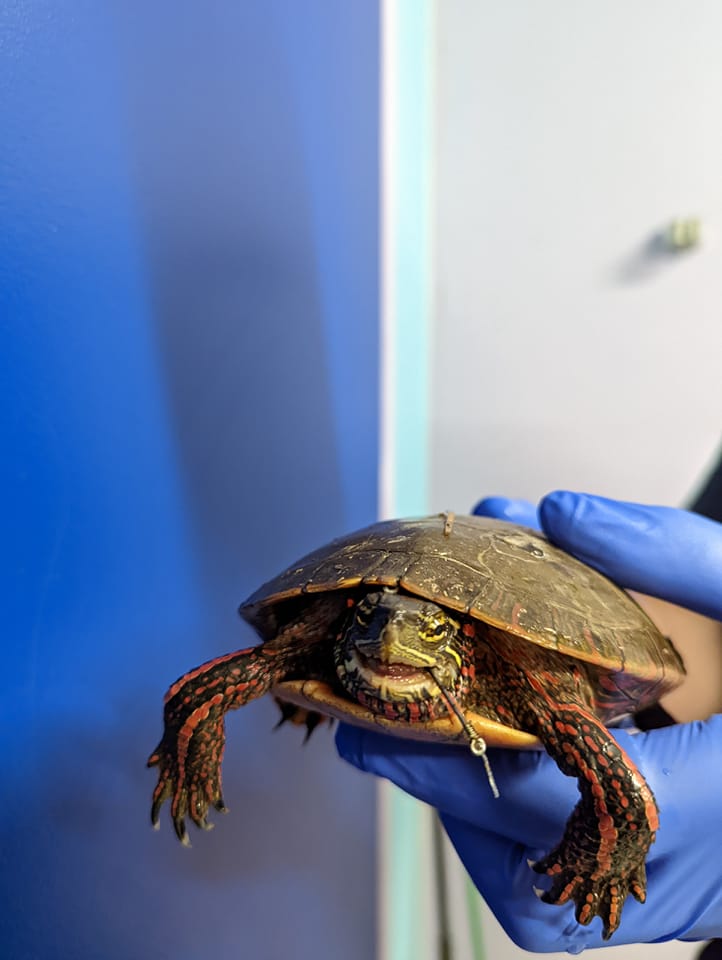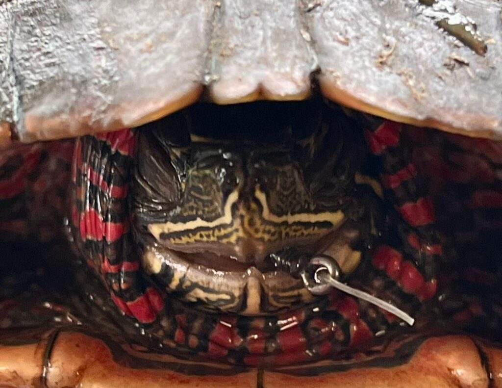 “This poor midland painted turtle was found sitting beside a hiking trail by a kind person who spotted the hook sticking out of his mouth,” the refuge posted on Facebook Tuesday.