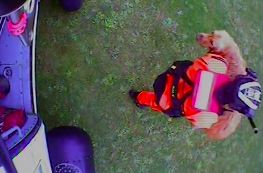 The aircrew member lifted Leo into their arms. They were clearly overjoyed and thankful at the happy reunion.
