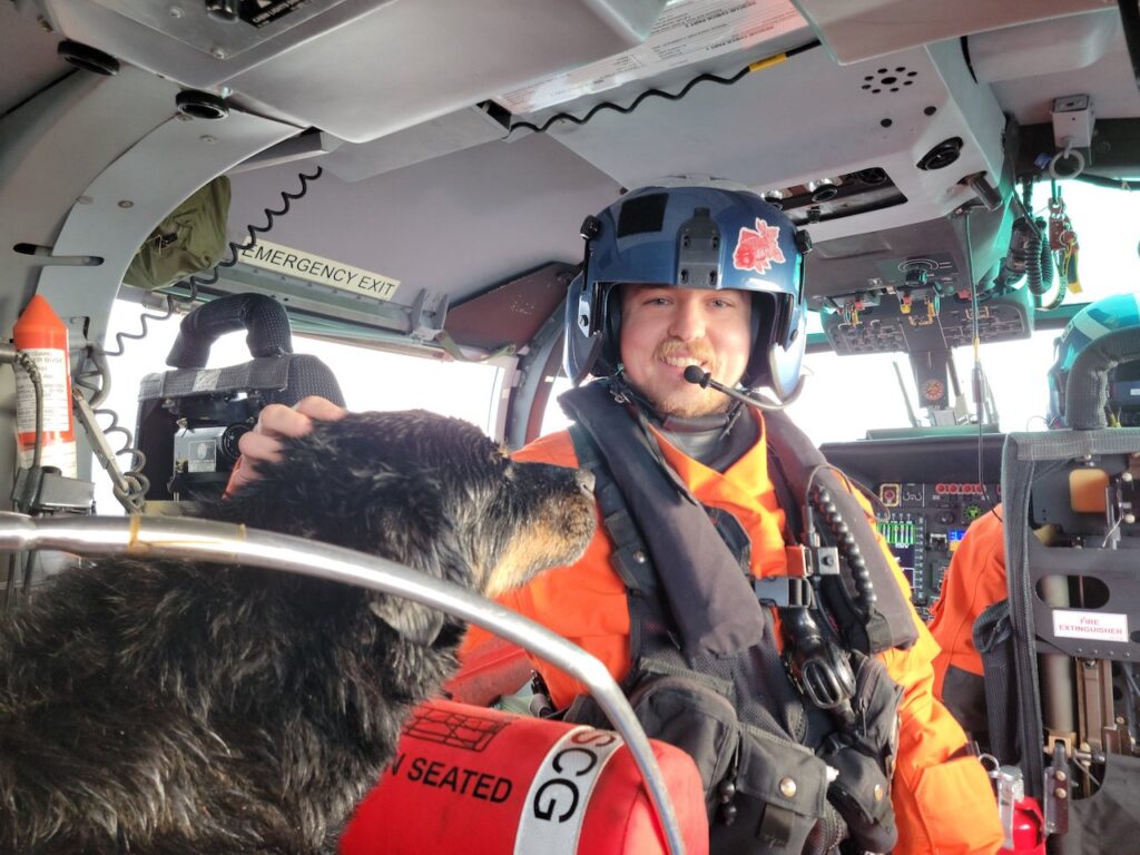Petty Officer 3rd Class Austen Marshall, an avionics electrical technician and a flight mechanic at Coast Guard Air Station Port Angeles, sits near a rescued dog. Photo: U.S. Coast Guard