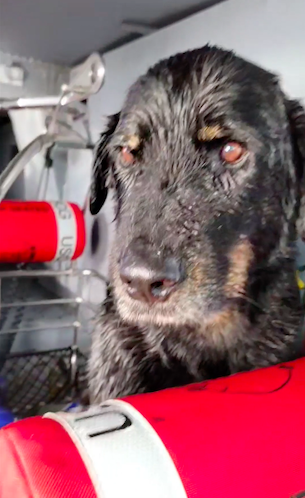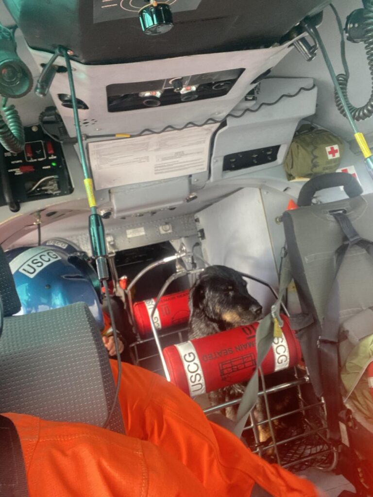 A rescued dog aboard an MH-65 Dolphin helicopter from U.S. Coast Guard Air Station Port Angeles after being hoisted from near Vancouver Island, B.C Photo: U.S. Coast Guard