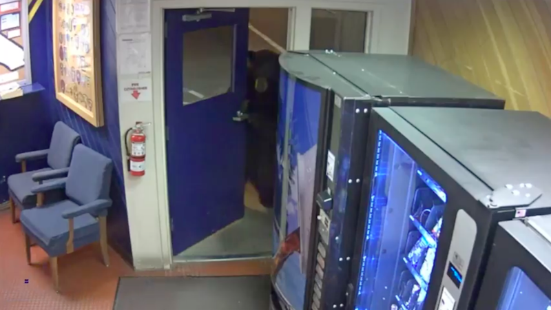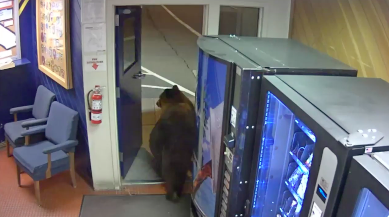 The bear stood on its hind legs and turned the door handle before briefly checking out the vending machines. While it was casing the joint, another bear remained on the lookout beyond the glass outside.