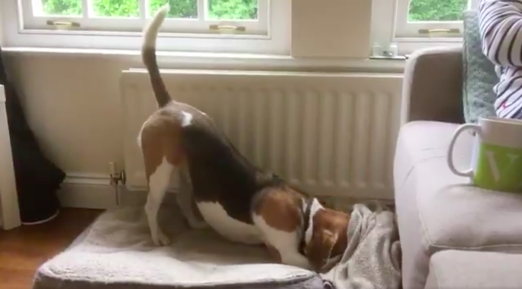 Daisy puts herself to bed like this at least three or four times a day, and I finally caught it good on camera. We never taught her (how could we?) She just does it because she loves being comfy #beagle #beagles pic.twitter.com/CAvL0s1EH3