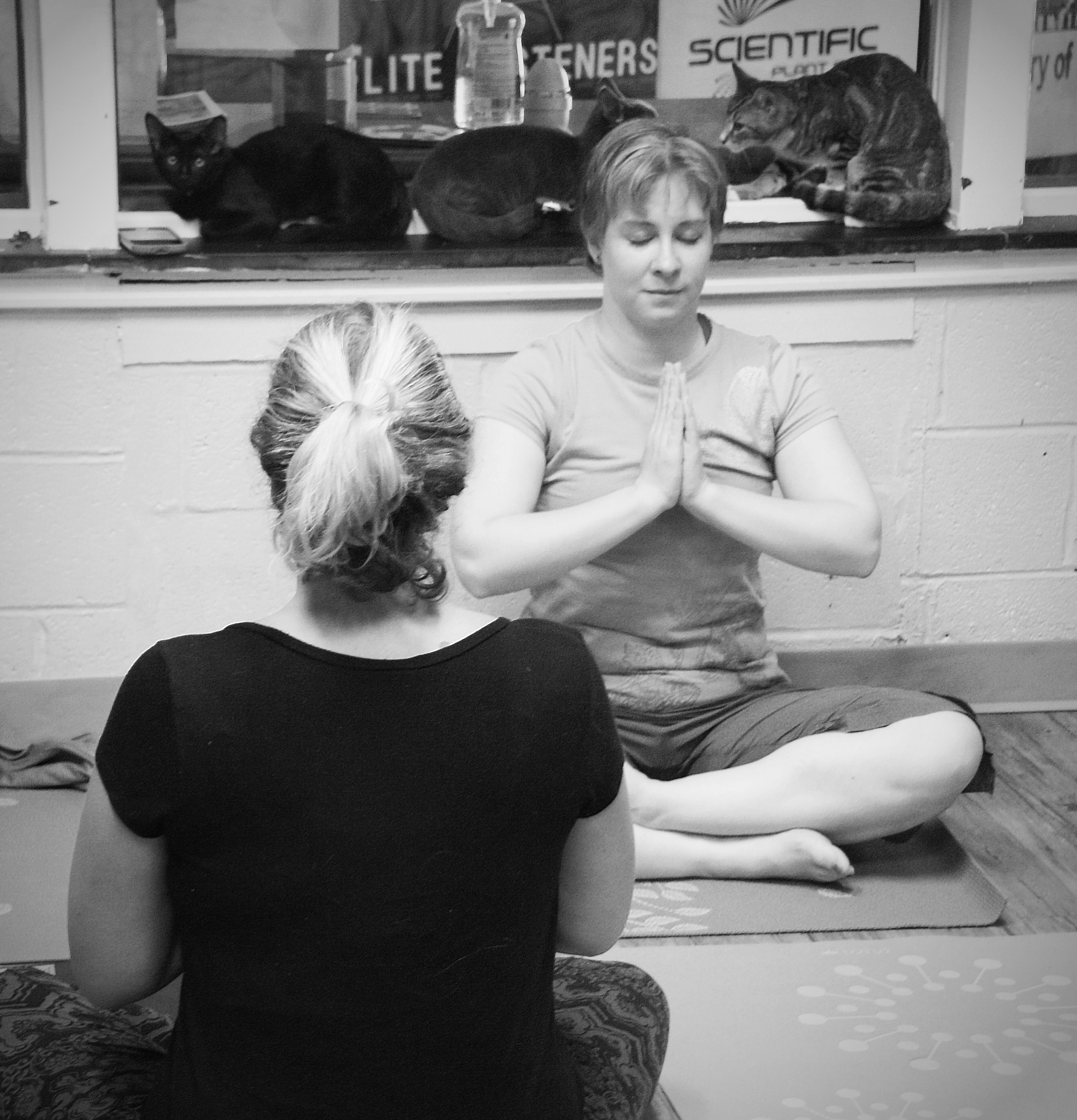 Class participant Amy Wildberger appeared to be the cat whisperer of the class with more than one cat seeking out her lap and her mat. At one point, she was hesitant to move and displace the kitten sprawled across her leg. “I’m going numb!” she said.