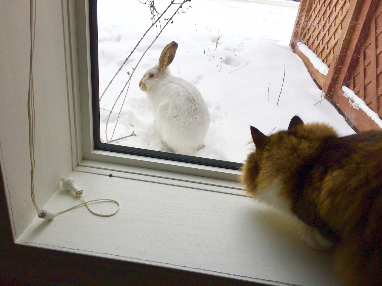 Still, it was pretty exciting when my rescue cat, Sheldon, a stray found wandering on the outskirts of the city little more than a year ago, came whisker-to-whisker with one very snowy-white hare.