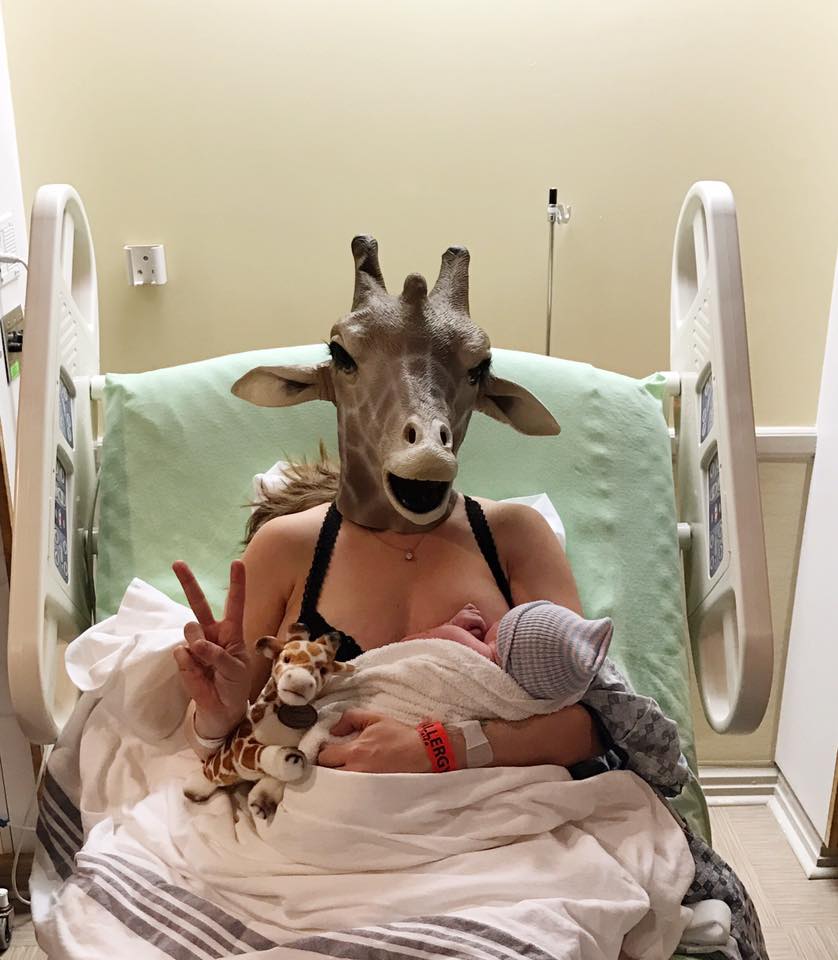 Erin Dietrich, recently best known as the giraffe mask mom, had her baby Wednesday night. She posted on Facebook: