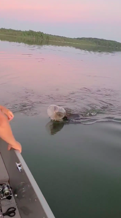“We’ve got a bear here,” she says off camera, as the family pursues the bear across Marshmiller Lake in Chippewa County in their boat. “The poor thing has got a tub stuck on its head. Oh, he’s getting scared.”