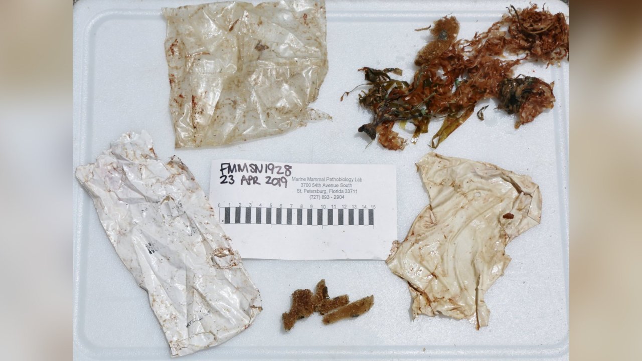 The emaciated and very sick young female rough-toothed dolphin was found stranded on Fort Myers Beach on April 23. After a necropsy, officials found in her stomach, a piece of a balloon and two plastic bags.